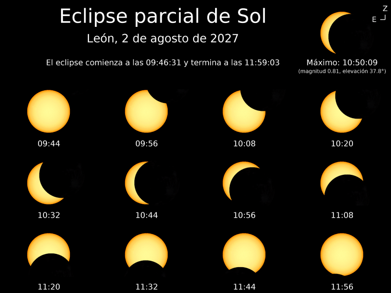 Durante la mañana del lunes 2 de agosto de 2027 tendrá lugar un eclipse de Sol que será parcial en la ciudad de León. Aquí alcanzará una ocultación máxima del 81 %.