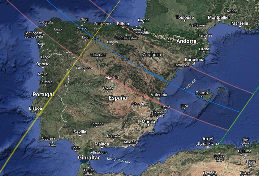 The map above (made by Xavier Jubier) indicates from which areas of the Iberian Peninsula you can observe the total eclipse (shaded area between the red lines). West of the yellow line, all the phases of the event can be seen; between yellow and green lines, the end of the partial eclipse cannot be seen because the sun will have set earlier.
