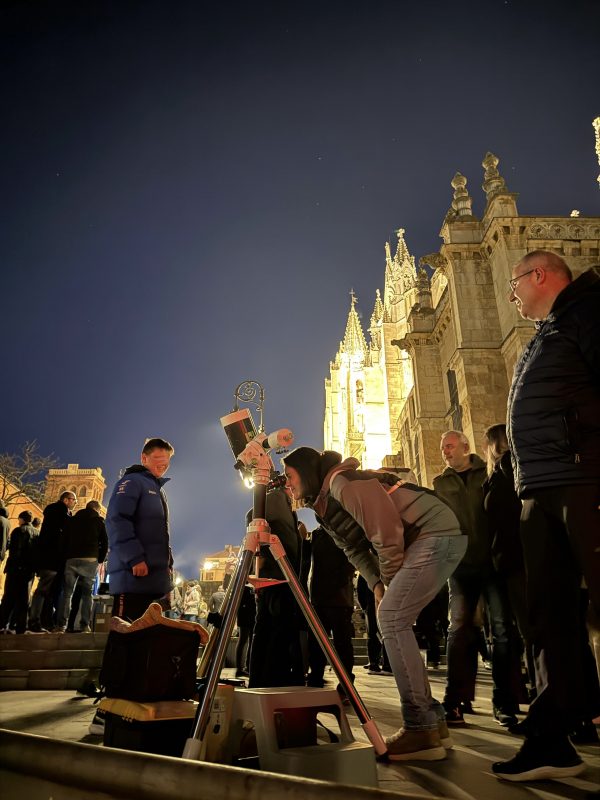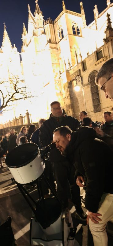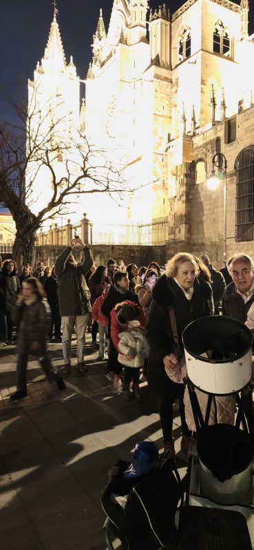 La Asociación Leonesa de Astronomía continúa celebrando el 40 aniversario de su fundación llevando la astronomía por todos los rincones de la capital leonesa. Con motivo de la alineación planetaria del pasado sábado se realizó una actividad pública en la plaza Puerta Obispo, detrás de la catedral.